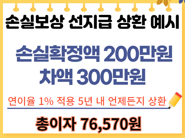 만약 선지급액을 500만원 수령하고 추후에 실제 손실보상액이 200만원 확정되었다면 그 기간동안은 무이자로 산정하여 200만원을 상환하게 되고 나머지 300만원에 대해서 연 1%의 저리로 5년 이내에 언제든지 상환할 수 있습니다. 이 때 5년간 300만원에 대한 총 이자는 76,570원입니다. 물론 중도상환수수료등은 없으므로 언제라도 여유자금이 생기면 상환이 가능합니다.