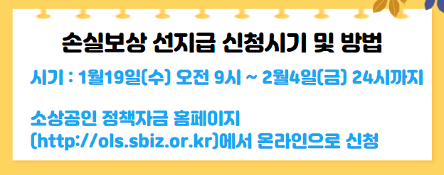 소상공인 손실보상 선지급금 신청은 19일(수) 오전 9시부터 2월4일(금) 자정까지 신청을 받으며 소상공인 정책자금 누리집에서 온라인으로 신청을 받습니다.
