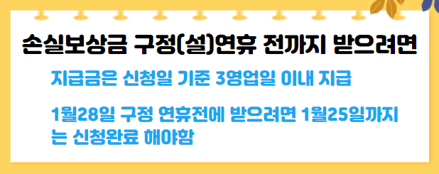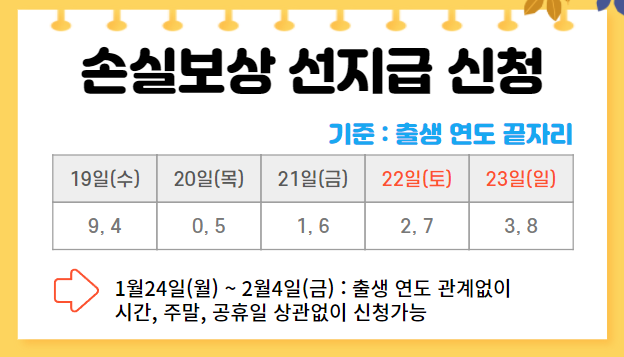 손실보상 지급은 신청을 하면 3영업일 안으로 지급되기 때문에 설연휴 전 1월28일까지 받으시려면 1월25일까지는 신청을 마치셔야 합니다. 따라서 자격이 된다면 19일 시작되고 출생 연도에 맞는 날 바로 신청하시는 것이 좋습니다.