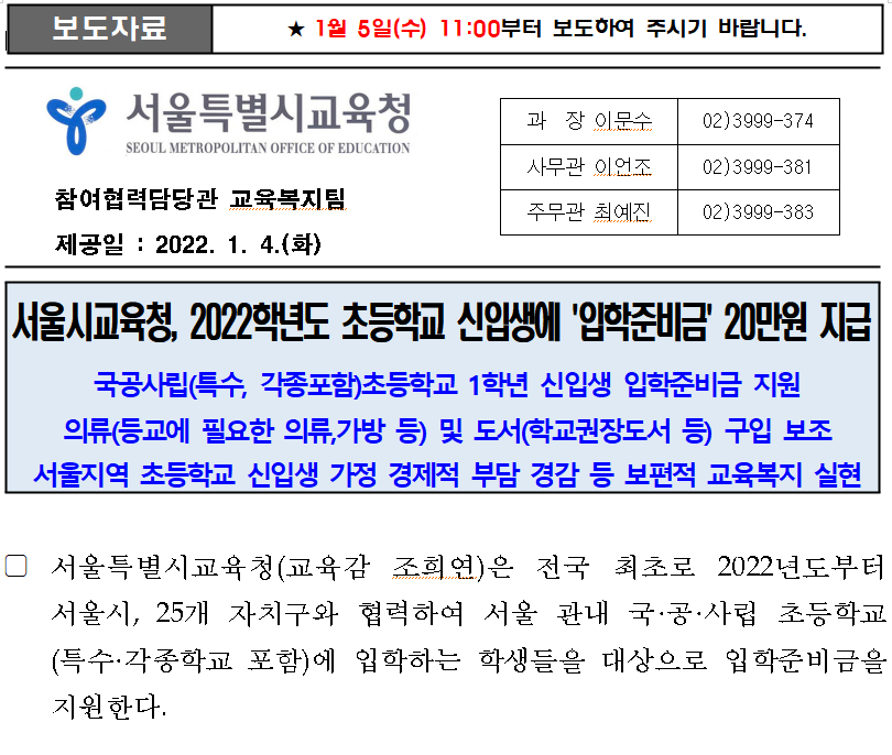 2022년도에 초등학교에 첫 입학하는 신입생들에게 20만원씩 지원하는 방안이 서울시 교육청에서 발표가 되었습니다. 이미 지난해부터 서울시의 중학생과 고등학생 신입생을 대상으로는 30만원의 입학준비금이 지원되고 있는데요. 이번 방안으로 인해서 초등학교 입학생까지 입학준비금이 지원될 예정입니다. 총 예산은 140억 원이며 교육청과 서울시, 자치구가 각각 4:3:3 비율로 부담하기로 했으며 특수학교는 물론 국.공립.사립 초등학교와 대안학교까지 모두 혜택을 받을 수 있습니다. 입학준비금은 언제 지원이 되며 어떻게 사용할 수 있는지 알아보도록 하겠습니다.