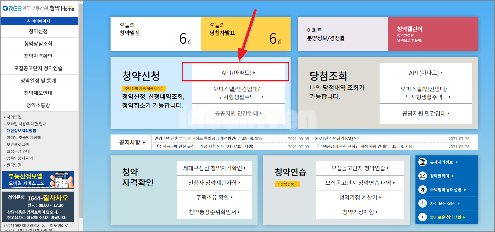 화면 가운데 청약신청에 있는 APT(아파트)를 들어갑니다.