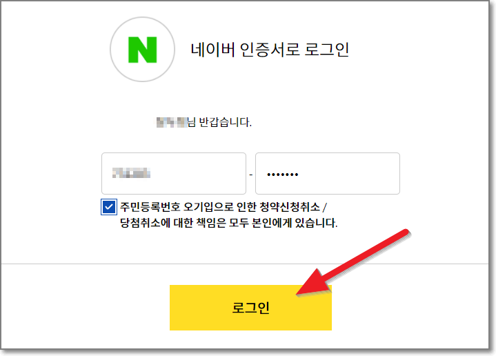 다시 청약홈으로 돌아와서 주민번호를 입력하고 주민번호 오기입으로 인한 책임을 체크하고 로그인을 합니다.