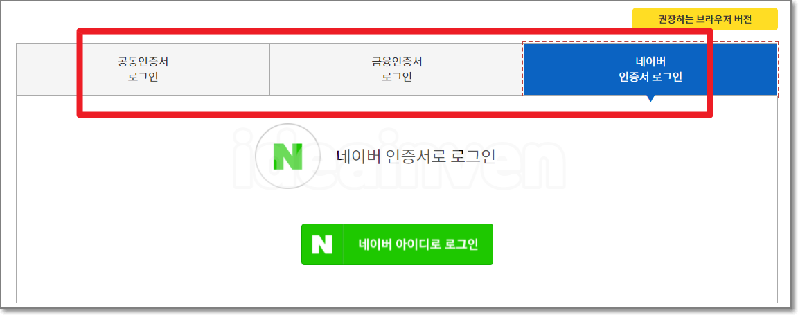 공동인증서, 금융인증서 또는 네이버 인증서중에서 원하는 방법으로 로그인을 합니다.