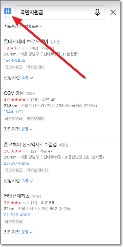 이제 기대하던 버튼이 나타났는데요. 화살표가 가리키는 "국민지원금"버튼이 생겼습니다. 이 버튼을 눌러보면 갑자기 지다고 사라지고 이 주변의 국민 지원금 사용 가능한 매장이 목록으로 표시가 되는데요. 다시 지도로 보고 싶으니까 왼쪽 상단에 있는 지도를 터치합니다.