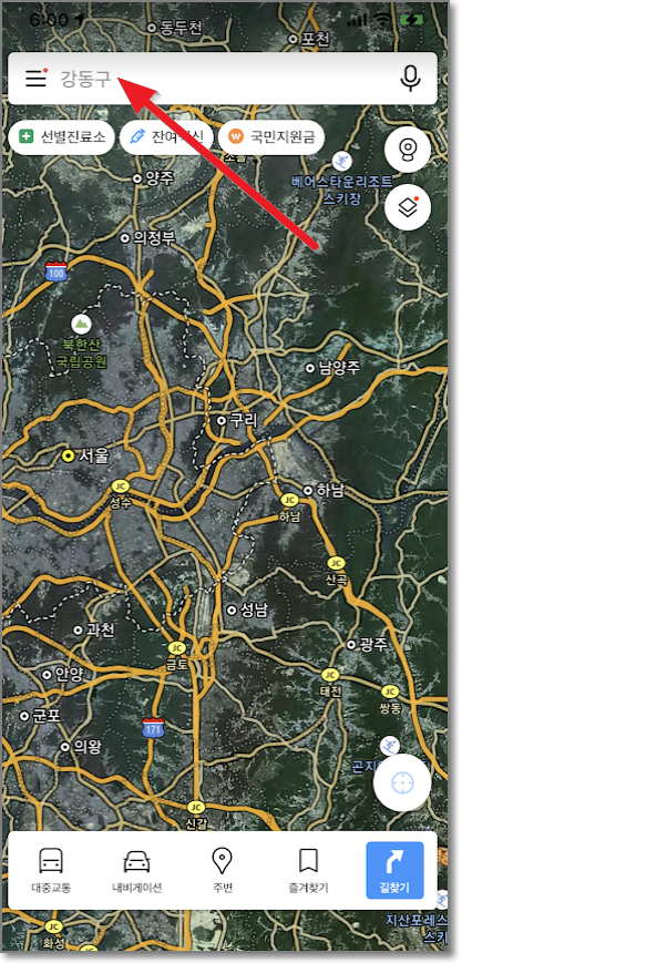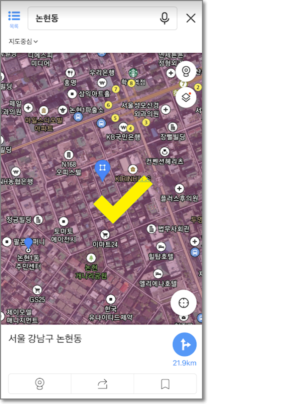 카카오맵을 스마트폰에 설치한 후에 실행하면 아래와 같은 지도 화면이 나옵니다. 지도 위에 보면 검색할 수 있는 칸이 있는데요. 이곳을 터치하고 원하는 동을 적어 넣습니다. 여기서는 "논현동"을 치겠습니다. 논현동을 치면 아래에서 논현동~논현2동 그리고 인천 남동구에 있는 논현동까지 나오게 되는데요. 원하는 제일 첫 번째 논현동을 터치합니다.