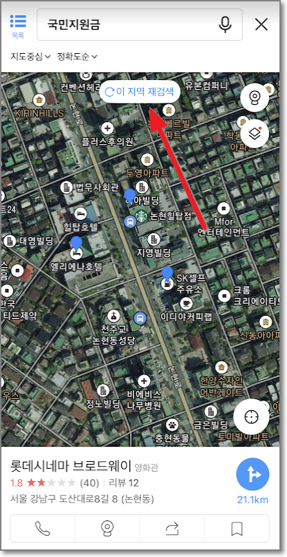 다시 논현동 근방의 지도가 보일텐데요. 좀 작은 것 같으니 원하는 장소가 잘 보이도록 확대를 해줍니다. 확대를 하면 처음에는 "국민 지원금 받는 가게가 별로 없네"라고 할 수 있는데요. 위에 있는 "이 지역 재검색"을 눌러보세요.