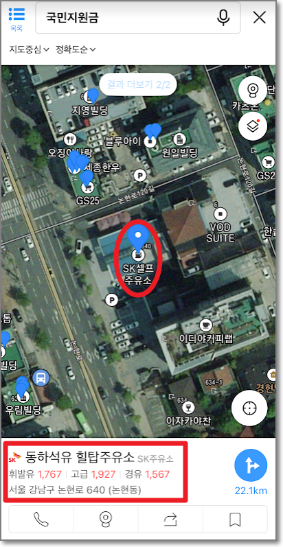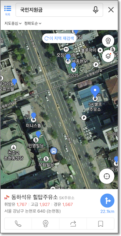 지도를 확대한 상태에서는 결과 더보기를 2번까지 할 수 있으며 이 때 검색된 파란 위치표시의 매장을 누르면 자세한 매장명을 볼 수 있습니다. 미니스톱(편의점)에서 국민 지원금 사용 가능하며 SK동하석유 힐탑 주유소에서도 국민 지원금이 사용 가능한 것을 볼 수 있습니다.