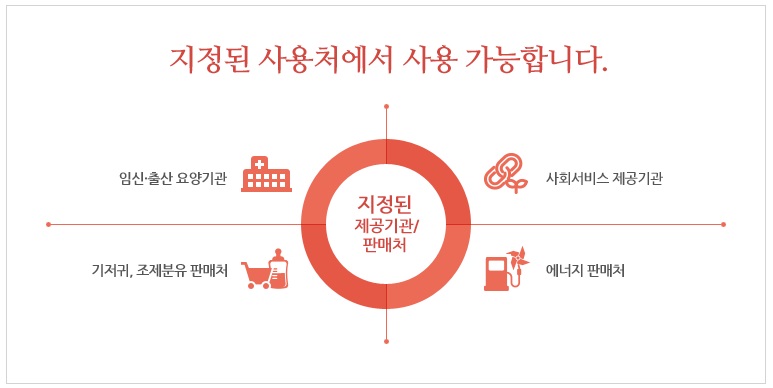 국민행복카드는 다양한 바우처로 나뉘어 있기 때문에 사업별로 정해진 사용처가 다릅니다. 건강보험 임신 출산 진료비 지원사업에 대한 바우처라면 건강보험공단에 지정하고 산부인과 전문의가 상근 하는 곳에서 사용이 가능하고기 저 귀 조제분유 지원에 관한 바우처라면 오프라인은 나들가게, 온라인은 우체국쇼핑몰을 통해 사용할 수 있습니다.