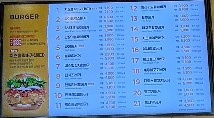 왜 "치즈홀릭버거(체다)"로 지었을까 생각을 해보게 되었는데요. 괄호 안에 (체다)라고 쓴 메뉴는 이 메뉴 하나뿐이었습니다. 나머지는 모두 괄호가 없습니다. 이상하지 않나요?