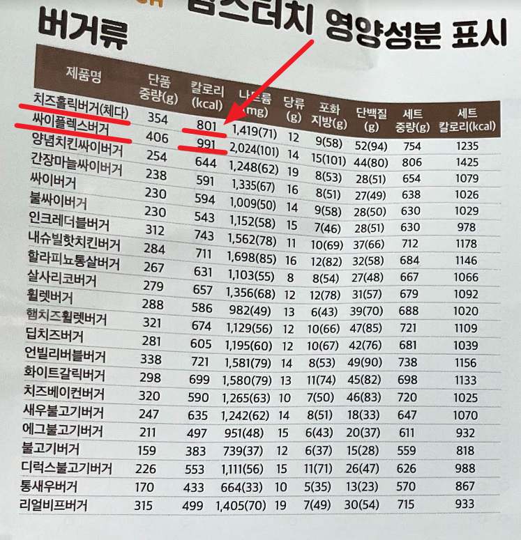 버거를 넣어준 비닐봉지 안을 보니 칼로리표가 들어있더군요. 버거류쪽을 자세히 보니 "치즈홀릭버거(체다)"는 단품이 801칼로리이며 세트는 434를 더한 1235칼로리입니다.