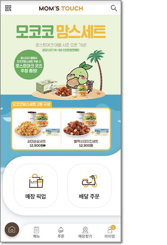 물론 배달의 민족으로도 주문이 되지만 맘스터치 앱을 한번 설치해서 이용을 해보았습니다. 앱을 설치하고 실행하면 가까운 맘스터치 매장이 보이며 "픽업(직접 가지러 가는 것)"을 할 것인지 "배달"을 할 것인지 정하고 그 상태에서 원하는 메뉴를 주문하면 결제까지 완료가 됩니다. 저는 기다리는 게 싫어서 "픽업"으로 했습니다.