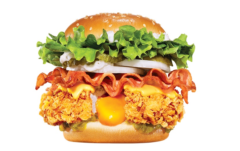 양배추 위에 번과 접착제 역할을 하는 소스가 묻어있고 닭가슴살 패티와 베이컨, 피클 등이 있습니다.