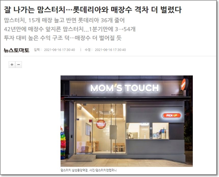 문득 맘스터치 매장의 개수가 궁금해서 찾아보았더니 2021년 6월 16일 기준으로 1348개라고 합니다.
