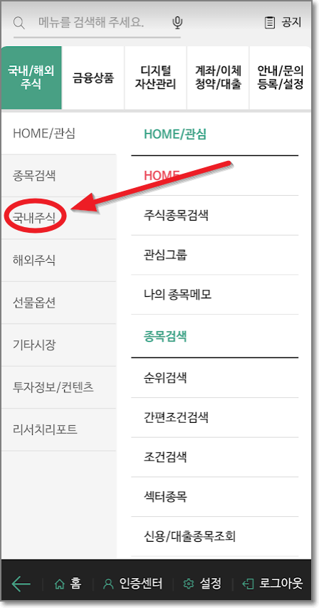 로그인을 했으면 화면의 왼쪽 아래에 보면 줄 세 개(전체 메뉴)가 있습니다. 캡처 화면에서는 환영 메시지가 가리고 있는데요. 금방 사라집니다. 뒤에 있는 줄 세 개를 누르고 전체 메뉴가 나오면 오른쪽 화면에서 처럼 "국내 주식"을 누릅니다.