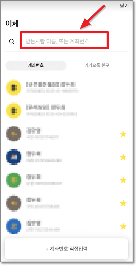 여기서는 "카카오 뱅크"를 이용해서 나무 앱 주식계좌로 이체를 해보겠습니다. 카카오 뱅크를 실행하고 "이체"를 누릅니다. 이체란에 계좌번호를 적으며 되는데요. 아까 위에서 적어놓은 계좌번호를 적습니다.
