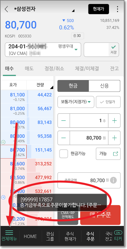 현금매수주문 확인 창에서 매수단가를 확인하고 (여기서는 80,700원입니다.) 주문전송을 누르면 오른쪽처럼 나올 것입니다. "증거금 부족으로 주문이 불가합니다." 그렇습니다. 계좌에 돈을 넣어놓지 않았습니다. 줄 세 개(전체 메뉴)를 누릅니다.