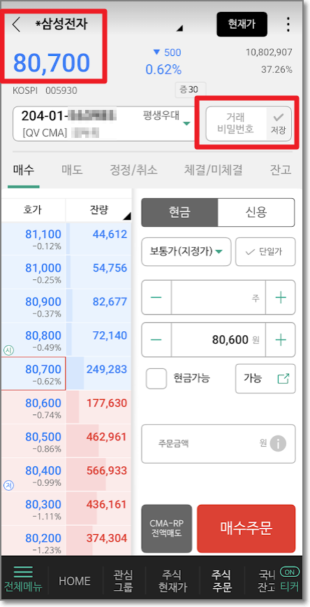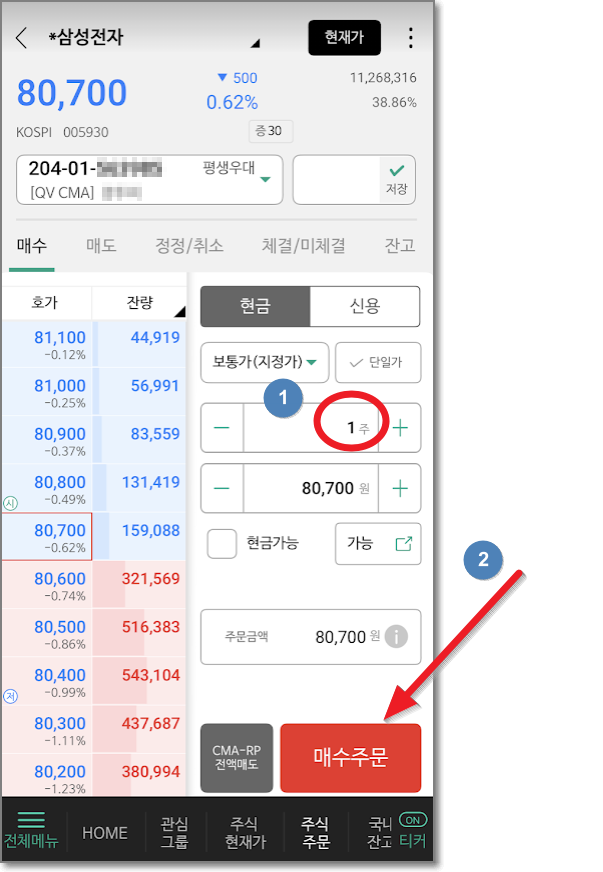80,700원인 삼성전자 보통주를 1주 입력하고 "매수주문"을 눌러서 "현금매수주문 확인"을 확인하고 "주문전송"을 누릅니다.