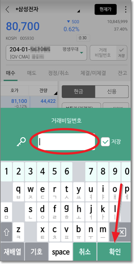 다시 나무 앱으로 돌아와서 주식주문하는 법에 대해서 계속 알아보겠습니다. 삼성전자 화면에서 화살표 친 주식수를 원하는 만큼 누르시면 되는데요. 물론 직접 입력하는 방법 또한 있습니다. 여기서는 1주를 사보도록 하겠습니다. 플러스를 1번 눌러서 1주로 만들고 주문금액이 80,600원인 것을 확인하고 "매수주문"을 누릅니다. 바로 거래 비밀번호를 누르라고 나올 것입니다. 누르고 확인을 누릅니다.