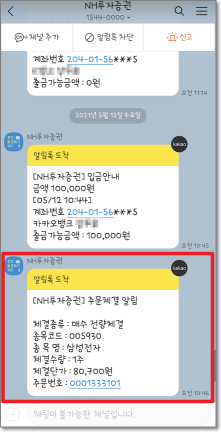 주문전송을 눌렀으면 실제로 잘 체결이 되었는지 확인을 해야 하는데요. 아래처럼 3번 확인할 수 있습니다. 우선 나무 앱에서 "매수주문이 정상적으로 접수되었습니다"의 밑에 빨간색으로 "매수체결"되었음을 알 수 있고, 또 "체결/미체결"을 눌러서 잘 체결이 되었는지 확인할 수 있고 마지막으로 카카오톡 알림 톡으로 삼성전자 1주가 제대로 매수되었음을 알 수 있습니다.