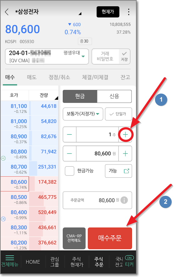 다시 나무 앱으로 돌아와서 주식주문하는 법에 대해서 계속 알아보겠습니다. 삼성전자 화면에서 화살표 친 주식수를 원하는 만큼 누르시면 되는데요. 물론 직접 입력하는 방법 또한 있습니다. 여기서는 1주를 사보도록 하겠습니다. 플러스를 1번 눌러서 1주로 만들고 주문금액이 80,600원인 것을 확인하고 "매수주문"을 누릅니다. 바로 거래 비밀번호를 누르라고 나올 것입니다. 누르고 확인을 누릅니다.