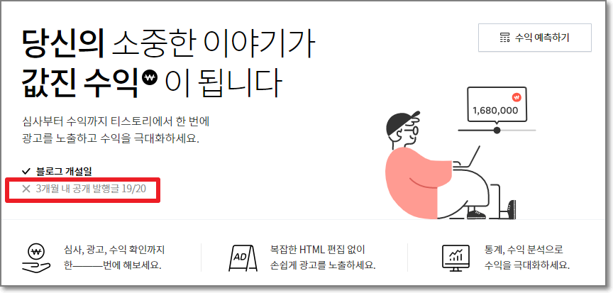 즉, 3개월내에 공개발행글이 20개는 있어야 카카오애드핏을 해주겠다는 것이네요.