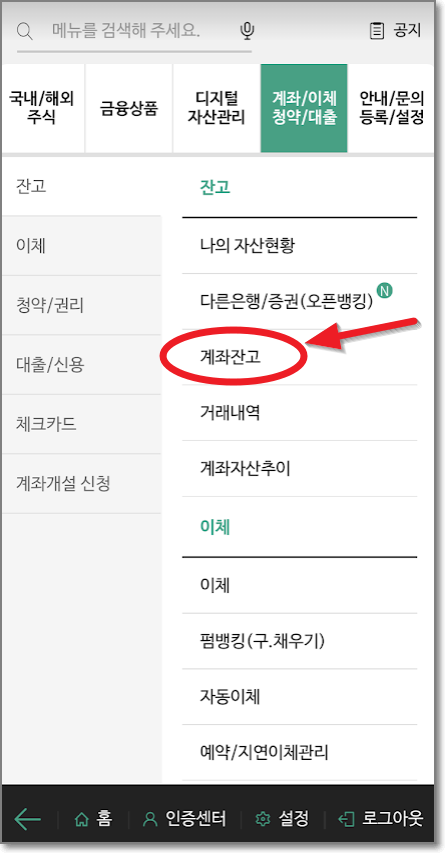 계좌에 돈을 입금하려면 계좌번호를 알아아겠지요? 전체 메뉴를 누르면 나오는 화면에서 "계좌/이체"를 누르고 아래에 나오는 "계좌잔고"를 누릅니다.