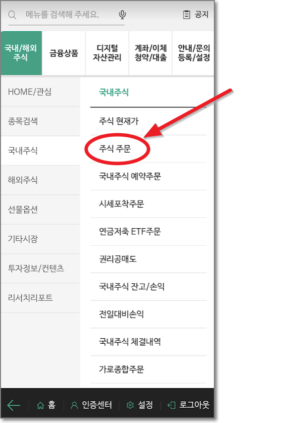 다시 주식 매수 창으로 가야 하므로 "국내/해외주식" > "국내 주식" > "주식주문"으로 들어갑니다.