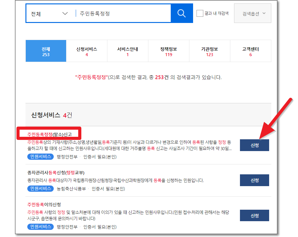 검색을 하면 서비스가 4건이 나올텐데요. 여기서 "주민등록정정(말소)신고"의 "신청"을 누릅니다.