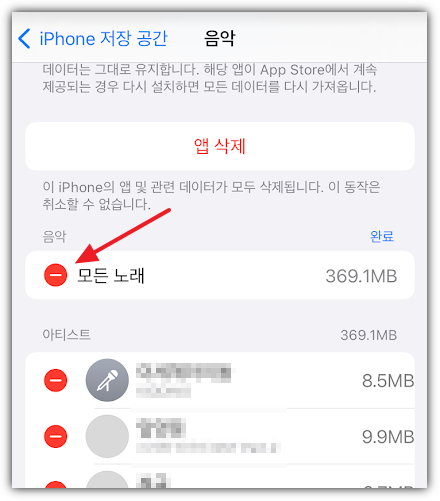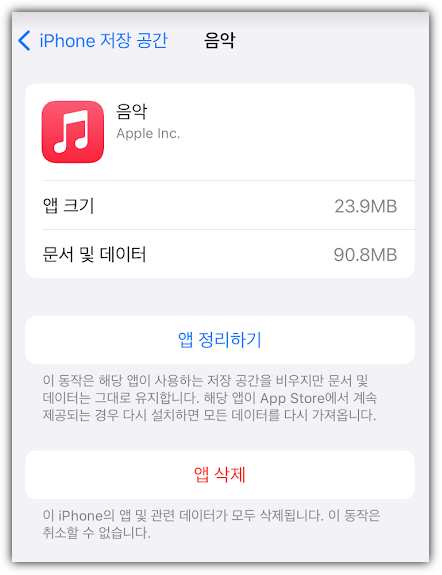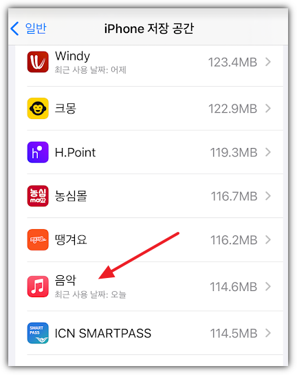 다시 'iPhone 저장 공간'으로 들어와보면 음악앱 말고는 노래가 아무것도 없음을 확인할 수 있습니다.