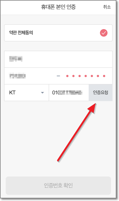 휴대폰 본인인증이 나오면 "약관 전체동의"를 누르고 이름과 주민등록번호 그리고 통신사를 고른 후 휴대폰 번호를 적고 "인증요청"을 눌러서 인증번호를 받습니다.