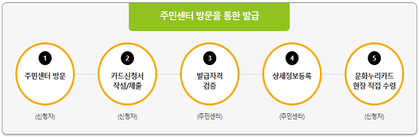 신청방법은 주민센터를 통한 발급과 문화누리 홈페이지를 통한 발급이 가능합니다.
