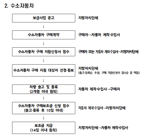 구매자는 차량구매대금과 보조금의 차액을 자동차 판매회사에 납부하고 자동차 판매회사는 지자체(국비보조금+지방비보조금)에서 보조금 수령