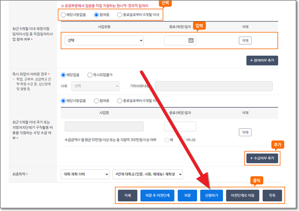 신청인의 취업경험은 수급대상자로 인정 받기 위해서는 신청일 이전 2년 이내에 통산 100일 또는 800시간 취업한 사실이 반드시 있어야 합니다. 아래를 모두 등록합니다.