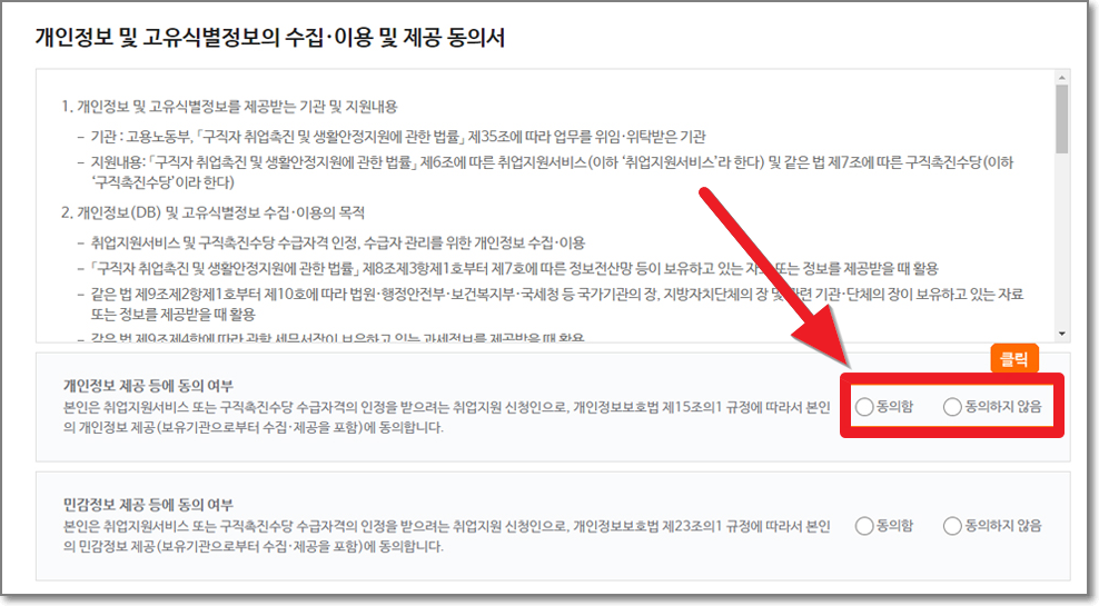 개인정보 및 고유식별정보의 수집.이용 및 제공동의서에서 "동의"를 선택합니다.