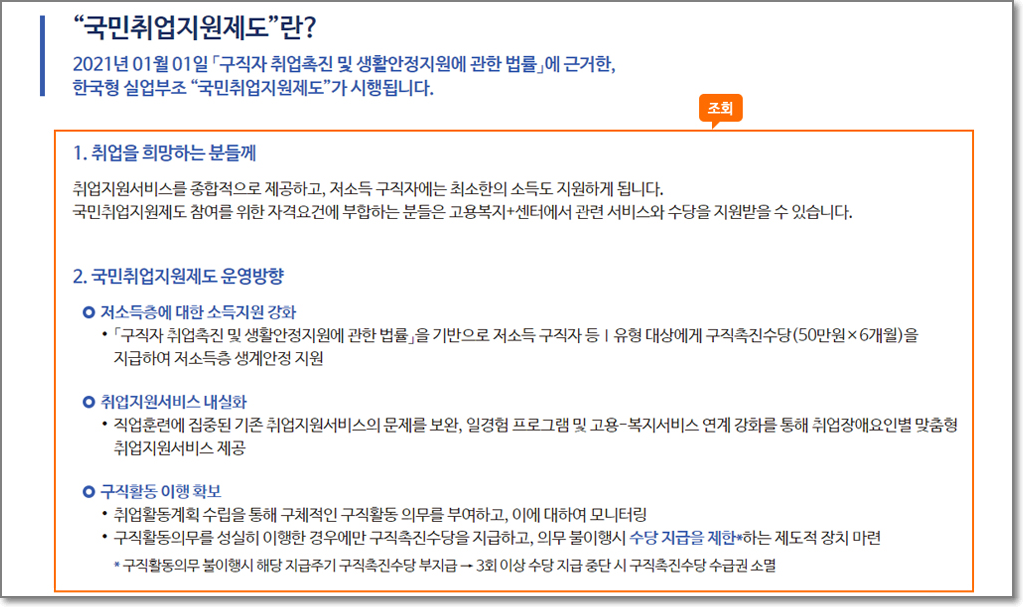 2021년1월1일 새해첫날부로 국민취업지원제도가 신설되어서 실시되고 있습니다. 지역 고용센터를 중심으로 진행하는 국민취업제도는 "한국형 실업부조(失業扶助)"이면서 2차 고용안전망으로써 지역사회에 있는 다양한 취업취약계층을 적극적으로 발굴하고 이들이 필요로 하는 고용과 복지서비스를 더 가까운 곳에서 맞춤으로 제공하는 것이 특징입니다. 실업부조(失業扶助)란 한자로 보면 직업을 잃었을 때 서로 거들어서 도와준다는 뜻으로 쉽게 말하면 고용보험의 대상을 확대한다는 의미입니다.