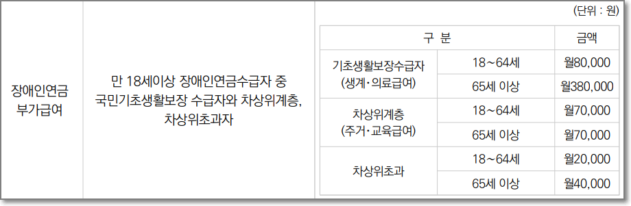 2021년 기준으로 소득인정액이 73만원이상 91만3천원 이하이신분들이 차상위 계층인데요. 이분들의 경우에는 64세까지는 장애인연금 기초급여 최대 30만원에 부가급여 7만원을 받아서 총 37만원을 지급 받았었는데 이분들이 65세가 되서 기초연금을 신청하게 되면 장애인연금 기초급여가 기초연금으로 전환이 되어서 부가급여 7만원만 받게 됩니다. 따라서 차상위 장애인 같은 경우에도 역시 수급금액은 37만원으로 완전히 똑같습니다.