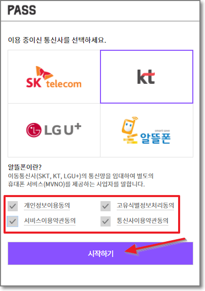 이제 아래처럼 이용중인 통신사를 고르라고 합니다. 위에서 말씀드렸듯이 본인을 확인하는 절차를 거치는 것이 이번 신청절차의 핵심입니다. 사용중인 통신사를 고르고 동의 4군데에 체크하시고 시작하기를 누르시면 됩니다. 여기서는 KT를 선택했습니다.
