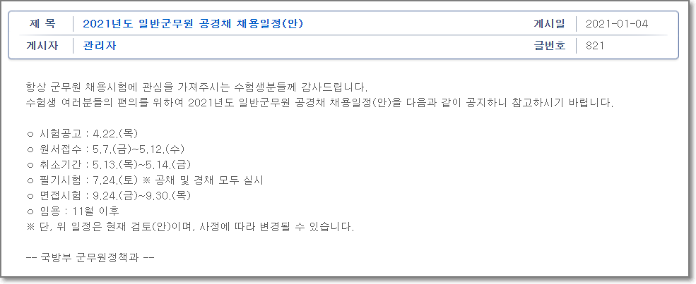위의 화면은 군방부 군무원 채용홈페이지에 공지가 나온 것이며, 내용은 아래와 같습니다.