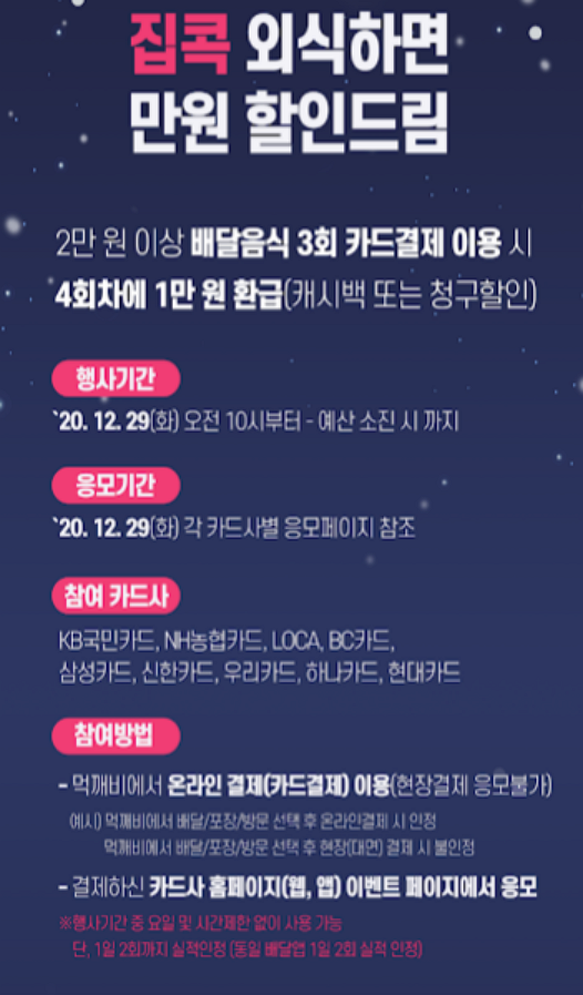 행사 응모카드로 배달앱에서 2만원이상 4회 결제시 카드사에서 다음달에 1만원 환급 또는 청구할인