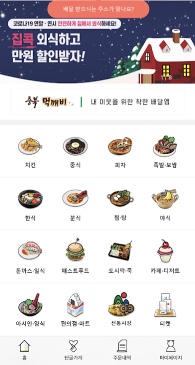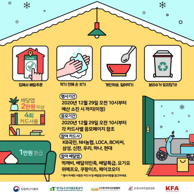 코로나19로 식당이나 카페를 방문하는 것 자체를 자제해야 하는 기간이므로 집에서 안전하게 음식을 주문해서 시켜먹자는 취지에서 하는 것입니다.(12월24일부터 1월3일까지 전국적 "연말연시 방역관리 특별대책" 시행중)