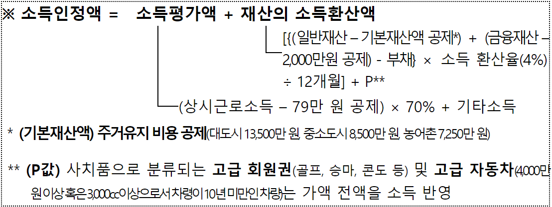 소득인정액에 관해서는 [소득인정액 계산법]을 참고하시면 좋으며, 간단하게는 아래그림과 같이 표현할 수 있습니다.