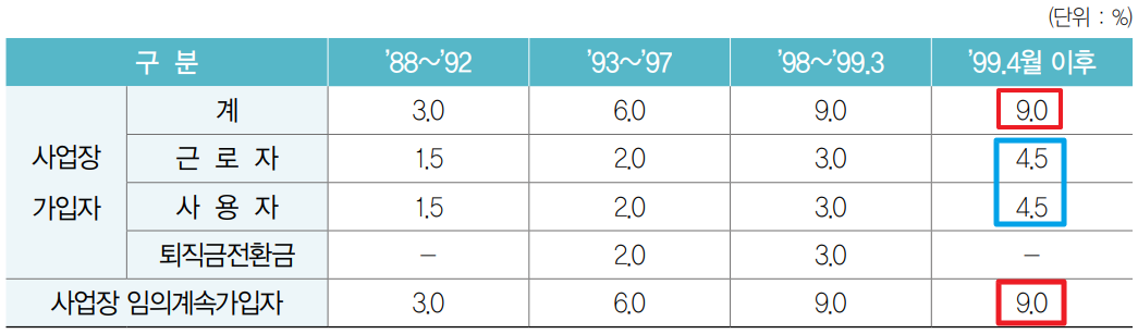 근로소득에서 내야하는 국민연금 요율은 1999년4월 이후로 쭉 9%로 유지되어 오고있으며 이중에 근로자가 4.5%, 사용자 즉 업주가 4.5%를 납부하게 되어있습니다.