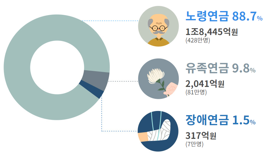 국민연금의 가장 많은 퍼센트는 역시 노령연금인데요. 전체 국민연금 수급자중에서 428만명이 노령연금을 받고 있으며 81만명이 유족연금을, 그리고 7만명이 장애연금을 받고 있습니다.