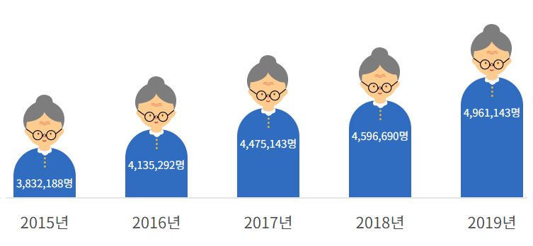 국민연금 수급자는 2015년에 약 383만명이었는데 2016년에 413만명으로 늘어가고 2019년에는 496만명이 국민연금을 수급하고 있습니다.