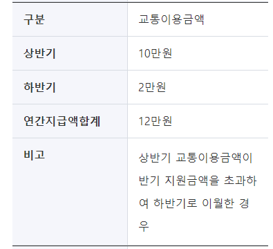 ● 지원내용 : 연간 12만원(반기별 6만원) 한도 내에서 대중교통 실사용액의 100% 지원