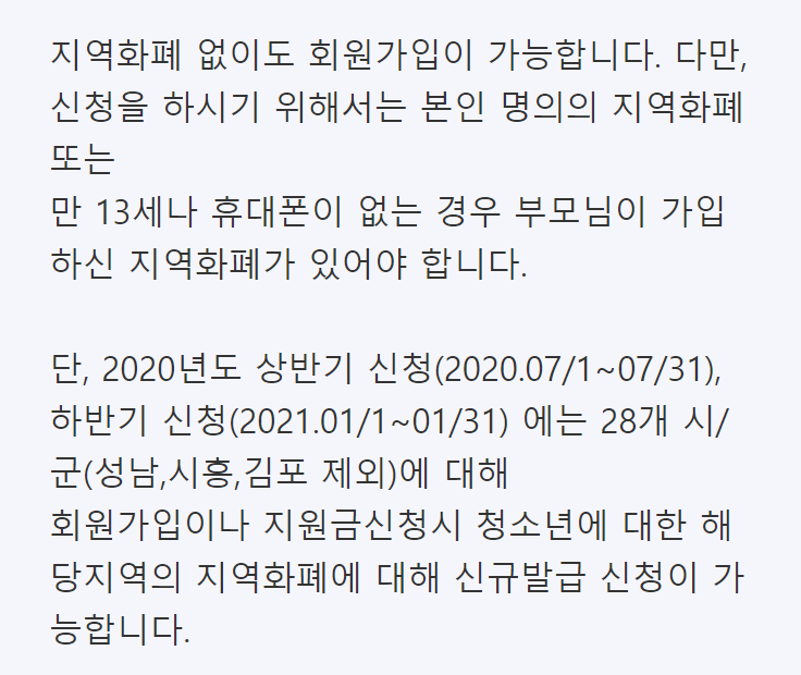 우선 경기도에 거주하는 즉 주민등록상의 주소지가 경기도이어야 하며 2020년 신청일 기준 만 13세에서 만23세의 청소년이 대상입니다. 지원금액은 6개월간 6만원으로 연간 12만원 즉 월1만원 정도이며 지원방법은 지역화폐앱이 있으면 앱으로 지급하며 휴대폰이 피처폰인 경우에는 대리인에게 지역화폐로 지급합니다. 한편, 제외대상이 있는데요.