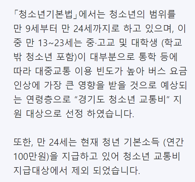 Q. 청소년 교통비 지원 범위를 만13~23세로 정하고 그리고 만 24세를 사업대상에서 제외한 이유는?