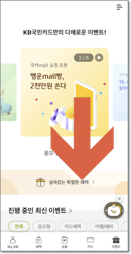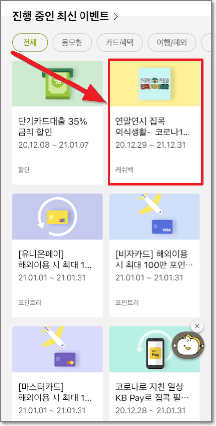 모바일로 (스마트폰으로) KB국민카드 앱을 열고 스크롤을 쭉 내리면, 연말연시 집콕 외식생활~이 있습니다. 터치!