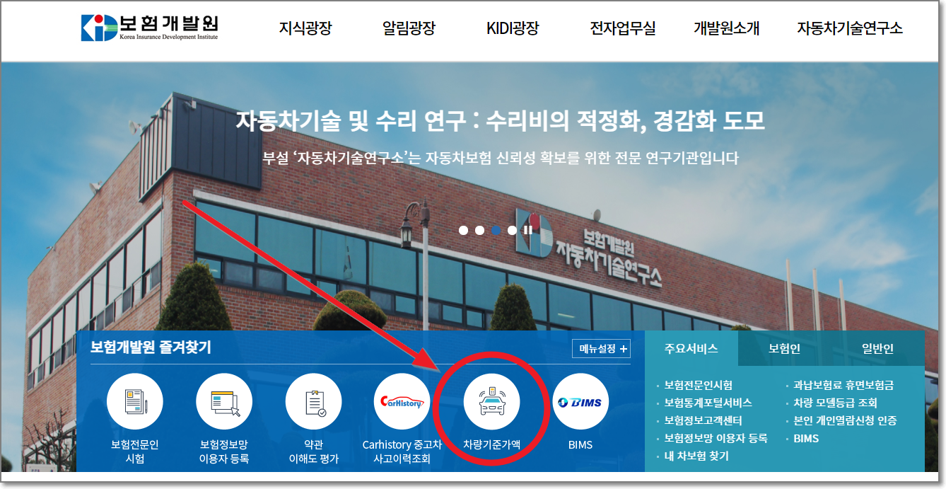 우리나라에서 차량가액이라고 하면 단 한곳에서 조회하게 통일을 해놓았습니다. 바로 "보험개발원"입니다. 링크를 누르면 새창이 열리게 됩니다. 아래와 같은 화면에서 "차량기준가액"을 누릅니다.