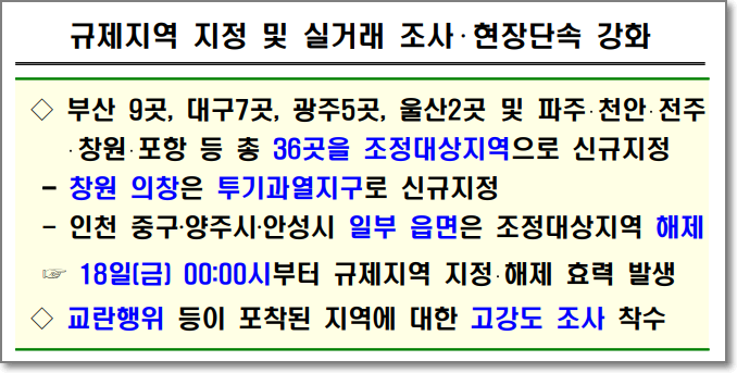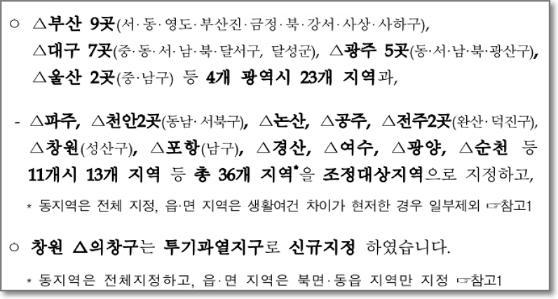 이번에 포함된 곳은 부산9곳, 대구7곳, 광주5곳, 울산2곳 그리고 파주, 천안, 전주, 창원, 포항 등 총 36곳을 조정대상지역으로 신규지정했으며,
